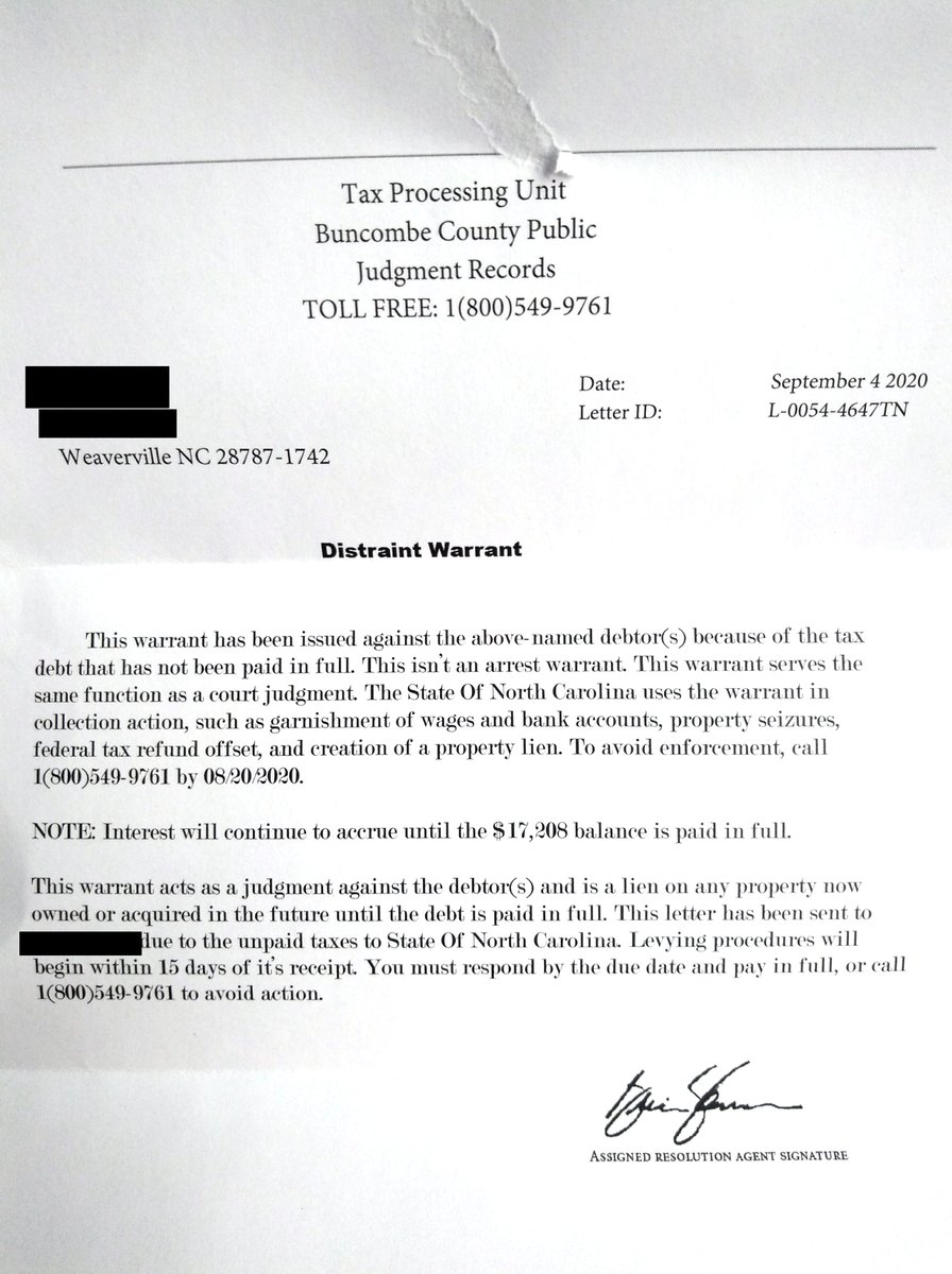 The letter claims that the notice is a Distraint Warrant Other areas of North Carolina have seen this scam in the past. The money wouldve been taken and never applied to the tax debt. Immediate Friday August 30 2019.